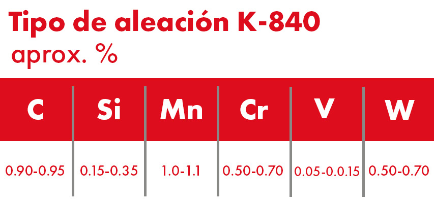 Acero aleado con Cromo (Cr), Vanadio (V) y Wolframio (W), de temple en aceite. Posee alta resistencia a la deformación durante el proceso de temple. Se obtiene una excelente dureza, resistencia al desgaste y gran tenacidad.