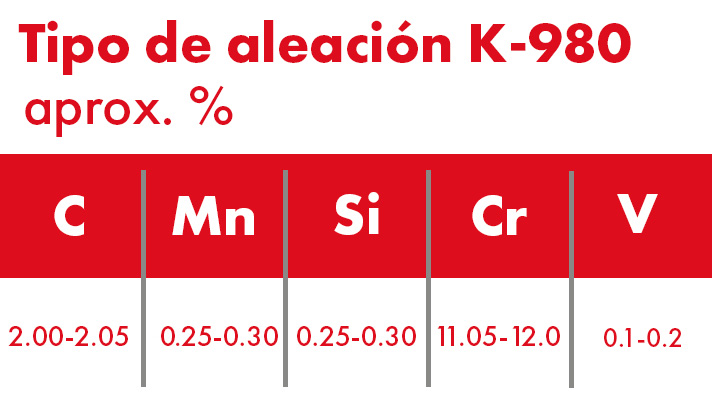 El K-980 es un acero de la familia de los aceros ledeburríticos con un contenido aproximado de 12% de Cromo. Es especialmente adecuado para herramientas de corte que requieren alta resistencia al desgaste y capacidad de mantener su filo afilado.