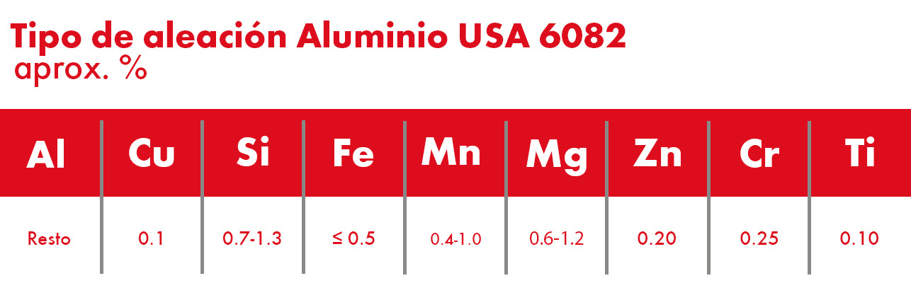 - El aluminio USA 6082 se somete a un tratamiento térmico durante su fabricación para garantizar su resistencia en aplicaciones más exigentes.